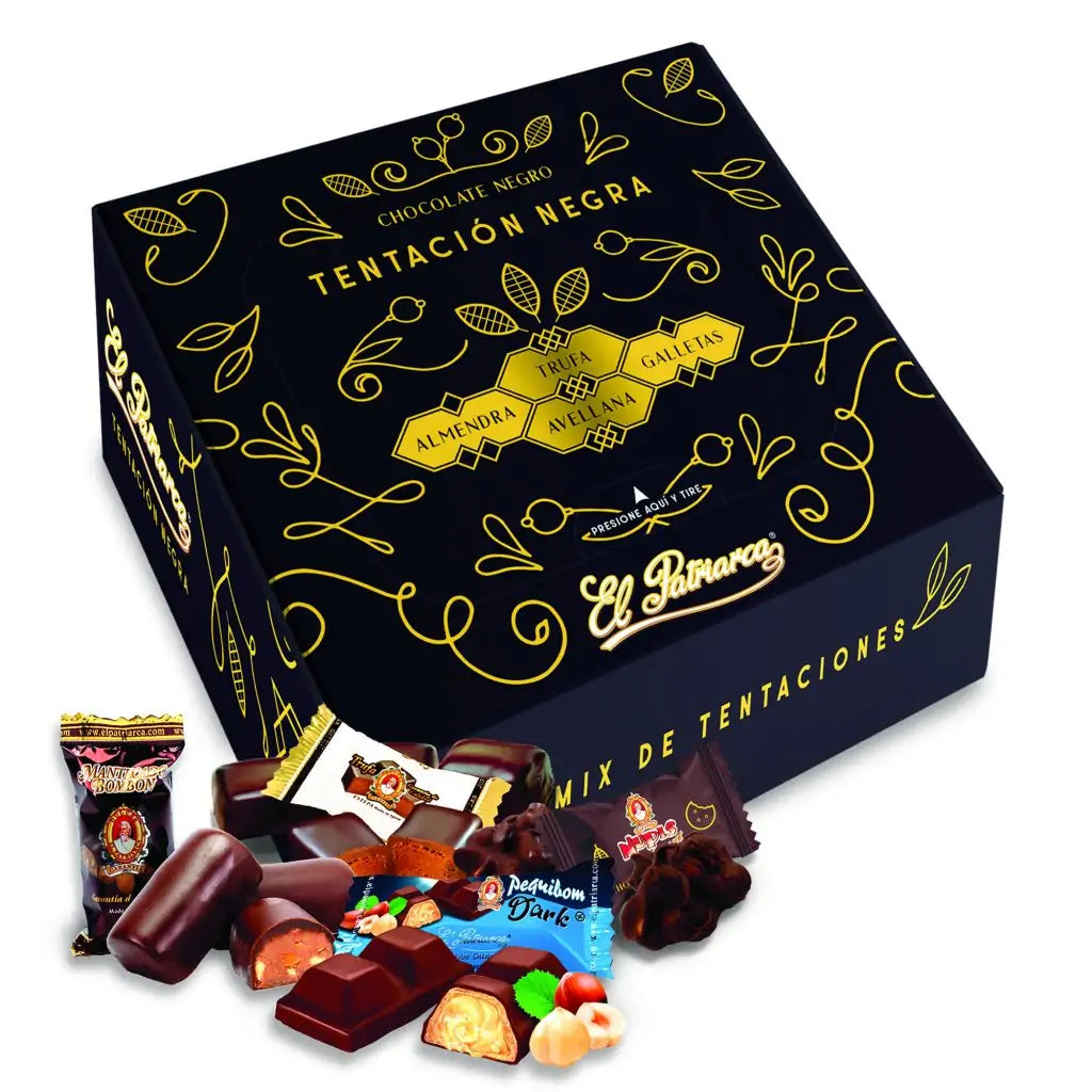 Tentación Negra 475g – Lass dich von der dunklen Seite der Verführung verführen! Dieses exklusive Sortiment von El Patriarca vereint vier köstliche Kreationen aus reinster dunkler Schokolade: